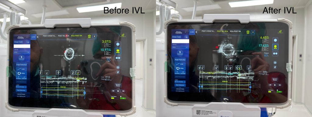 The intervention was performed by Dr. dr. Amir Aziz Alkatiri, Sp.JP (K), FIHA at RSJPD Harapan Kita. After the initial usage of a rotational atherectomy and cutting balloon, the vessel was opened up to allow the guidewire for the IVL catheter to pass through. A Sonico-CX IVL 3.00 mm catheter was advanced across the lesion. After just 2 cycles (20 pulses), the vessel already showed signs of clearing up, although the maximum 120 pulses was applied to ensure no calcium deposit was left uncracked. Following this, stent implementations across three lesion sites were performed, ensuring maximal long-term vascular health.